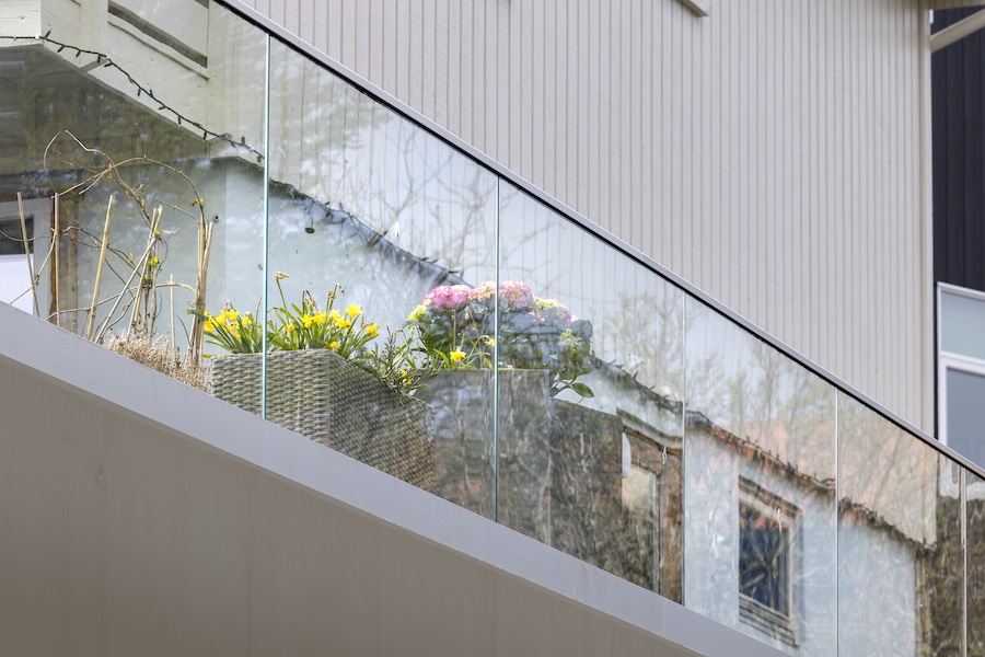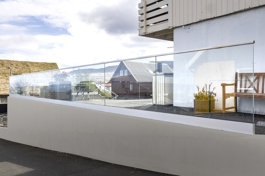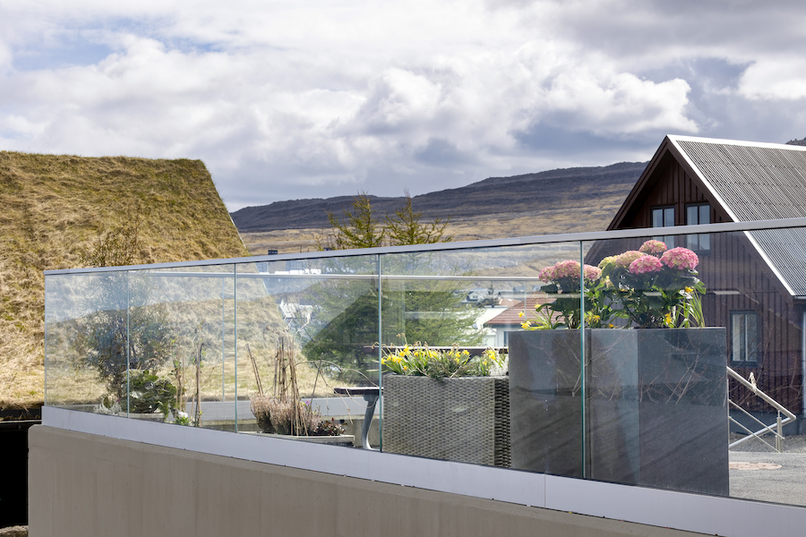 Snøgga glasterassan við aluminiumskinnara inn á vangan ger, at útsýnið verður varveitt, men skermar móti vindi. Omaná glasinum liggur ein hondlisti úr rustfríum stáli.