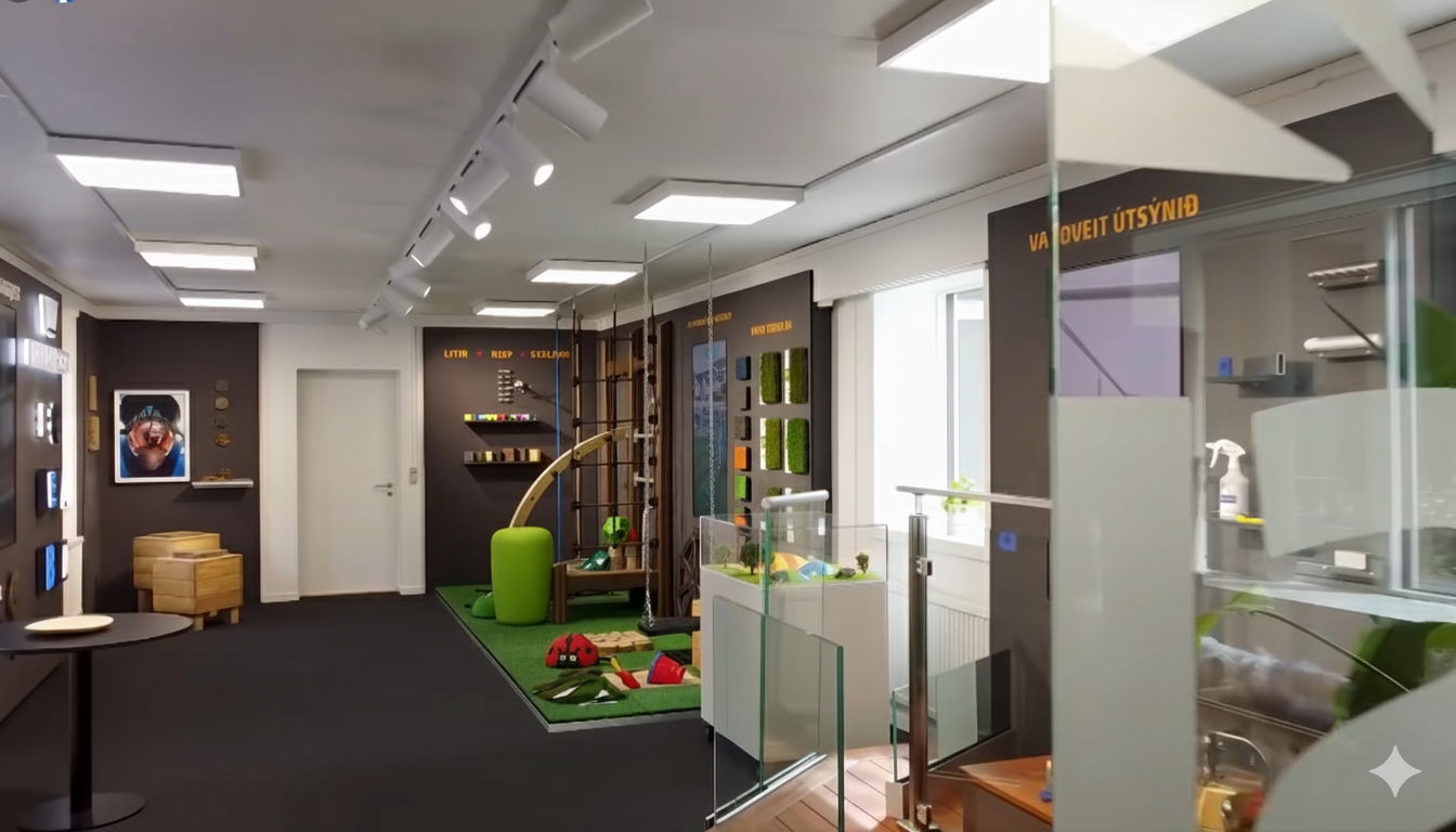 Í okkara sýnisrúmi fær tú eina veruliga kenslu av dygdini av okkara vørum. Her kann tú síggja og nerta við tilfarið, uppliva haldførið og fáa eitt greitt innlit í, hvussu okkara loysnir innan spælipláss, skeltir og glasgirðingar kunnu hóska til júst tín tørv.